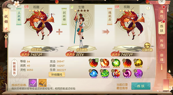 妖姬有属于自己的稀有等级:R-SR-SSR-UR,稀有程度越高的妖姬品质越好,初始技能等级也和妖姬的稀有程度成正比。初生妖姬随机带有1-2个技能。图中所示妖姬携带技能至少8个又是怎么来的呢?原来,妖姬可以通过炼妖把其他妖姬的天生技能掠夺!通俗来相当于融合,融合外观可以在融合妖姬中挑选其一。