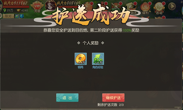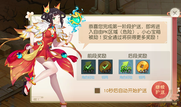 在完成第一阶段,后进入自由PK区域。因为存在一定风险,会被劫,会被打,所以安全通过就会获取更多的奖励喔。护送过程中可向在线好友及帮派成员发送求救保护,同意保护即会成为保护者。