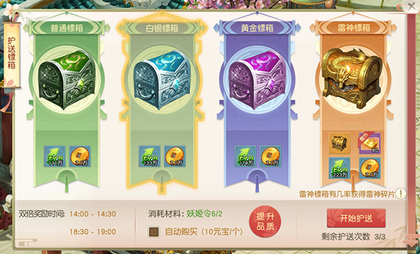提升护送镖箱的品质需要消耗固定数量的妖姬令,所以每天有3次护送机会。保护奖励会根据玩家等级发放,和保护的镖箱品质无关联喔。