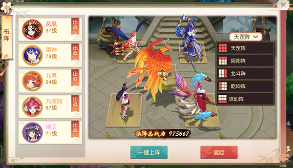 在妖姬竞技里面,有5种阵法:天罡阵、阴阳阵、北斗阵、乾坤阵、诛仙阵。我们可以选择不同的阵法排兵布阵,派上不同的妖姬,增加胜率!